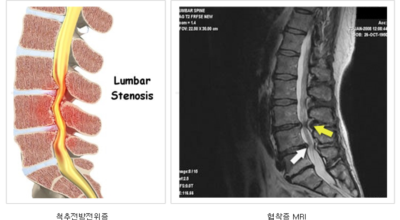 정상인 사람은 척추가 완만히 휘어져 있는데 척추관 협착증인 사람은 더 일자로 펴져 있고 정상인 사람의 척추관은 공간이 적당한데 비해 척추관척 협착증인 사람은 척추관이 일그러져 있어요. 척추관 협착증 환자는 자기 공명 영상(MRI)에서 보면 척추관 내 신경을 싸고 있는 경막 안에 정상에서 보이던 뇌척수액이 보이지 않는다는 특징이 있어요.